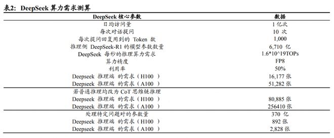 据国泰君安测算,假设DeepSeek日均访问量为1亿次、每次提问10次,每次提问的回复用到1000个token,1000个token大概对应750个英文字母,则DeepSeek每秒的推理算力需求为1.6*1019TOPs。在这种普通推理情境下, 假设DeepSeek采用的是FP8精度的H100卡做推理,利用率50%,那么推理端H100卡需求为16177张,A100卡需求为51282张。