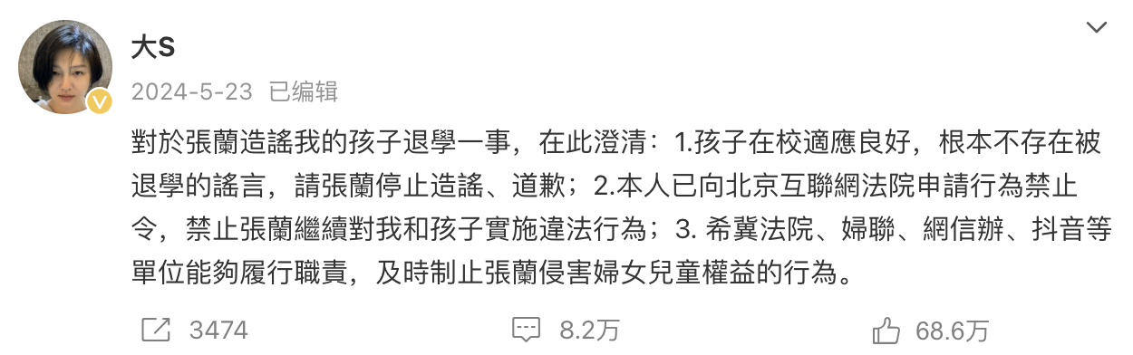 在生前最后一条微博里,徐熙媛要求张兰停止造谣,向北京互联网法院申请禁令,呼吁抖音等平台履行治理职责。但直至生命结束,才有实质的进展。