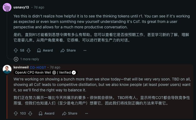 而除了过程的可读性外, OpenAI 的一众员工在 Reddit 答网友问的时候,也提到了一个点,公开原始思维链会导致竞争性蒸馏。