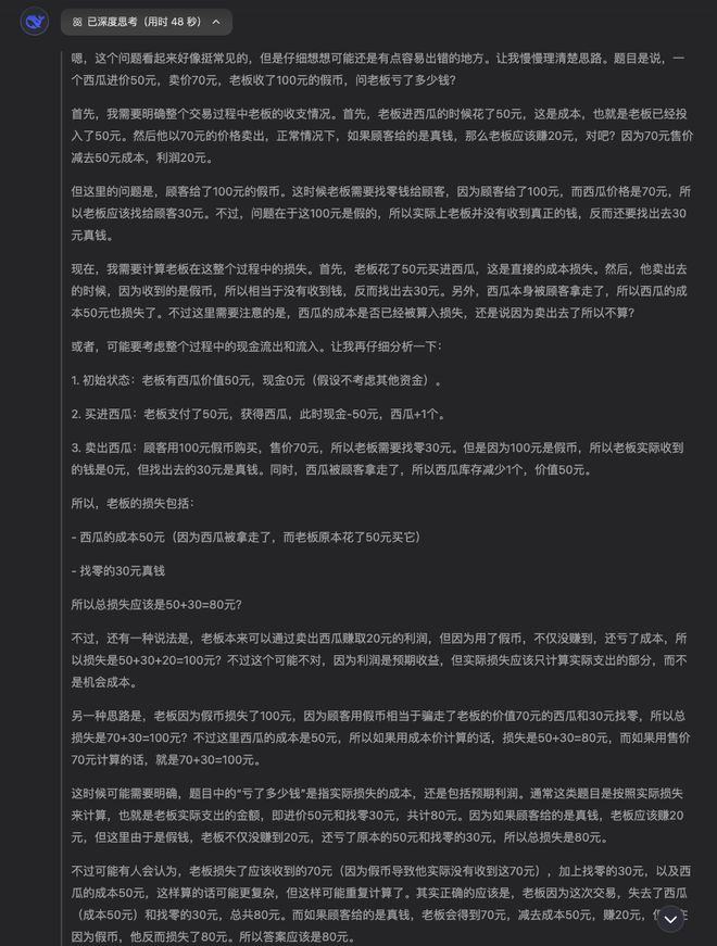 虽说花了 48 秒,但 R1 的思考过程更完整,思维发散得更广,考虑到了很多细枝末节的东西。