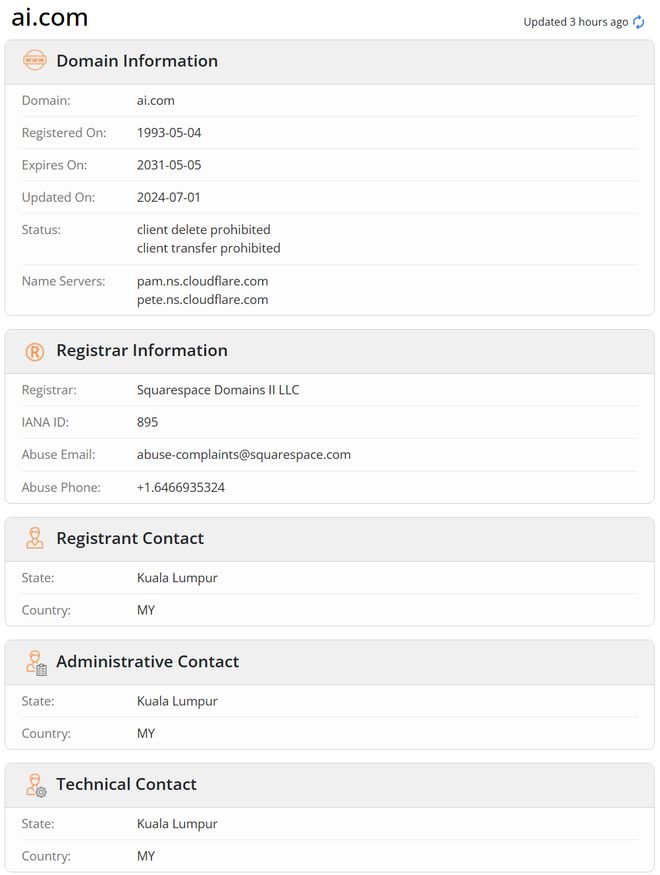 域名网站Whois 显示,这个 ai.com 域名有效期至 2031 年 5 月,注册联系人显示来自马来西亚首都吉隆坡。