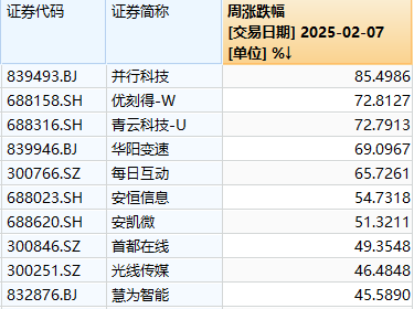 涨幅前8名中有7只属于DeepSeek概念,并行科技(85.5%)、优刻得(72.81%)、青云科技(72.79%)包揽前三。