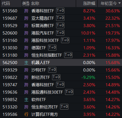 机器人ETF目前年内涨幅已达到15.68%,领先前述软件ETF约1.4个百分点。