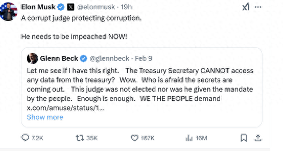 当地时间周日,愤怒的马斯克在X上发帖,称恩格尔迈耶是“一个保护腐败的腐败法官”,并补充称,“他现在就需要被弹劾!”