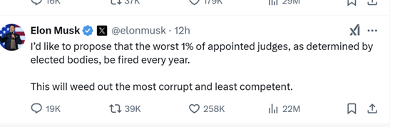 马斯克还发帖呼吁每年解雇最差的1%的法官,称“这将淘汰最腐败和最不称职的人”。