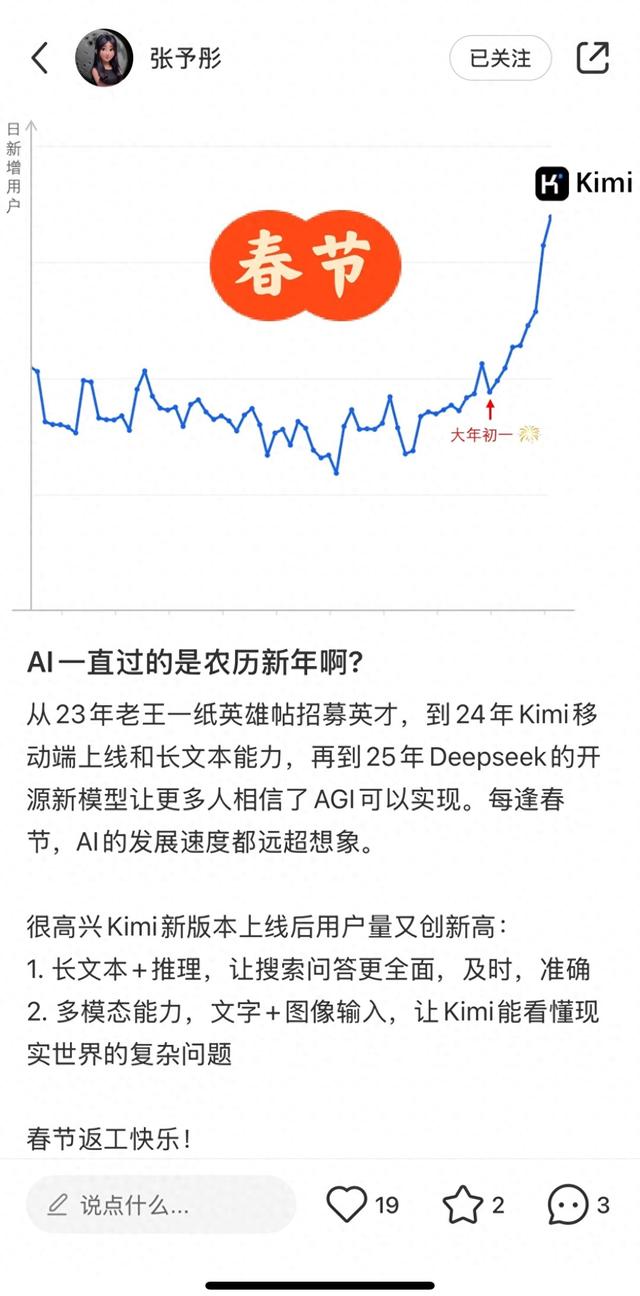 今日,张予彤在朋友圈和社交媒体披露,Kimi新版本用户量创新高,并感慨AI行业“每逢春节发展速度远超想象”。