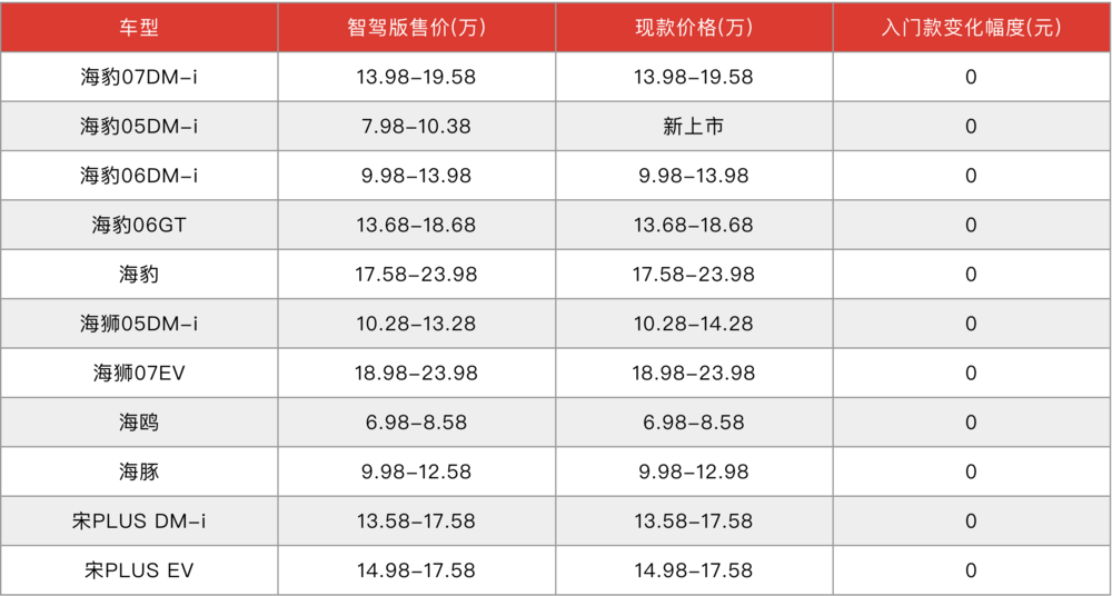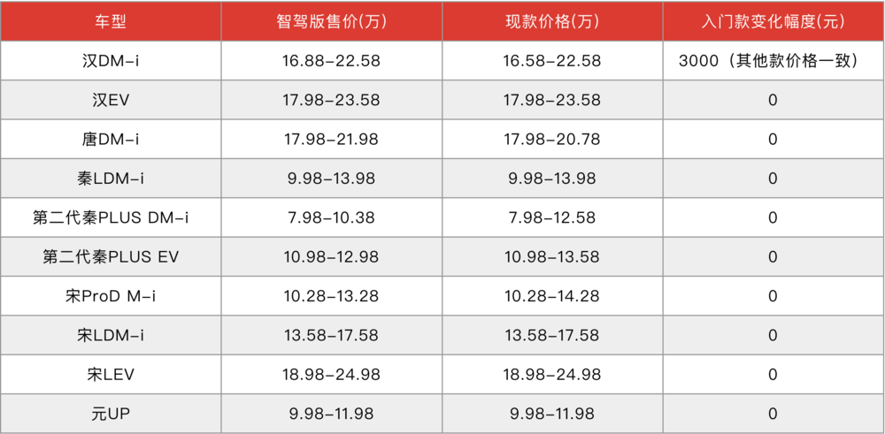 虎嗅根据目前比亚迪官方和公开价格库统计,升级智驾版的21款车型中,除了汉DM-i的入门款进行了3000元的小幅价格上调,海鸥非智驾版主动价格下调了3000~5000元之外,均做到了车款智驾升级之后价格不变。