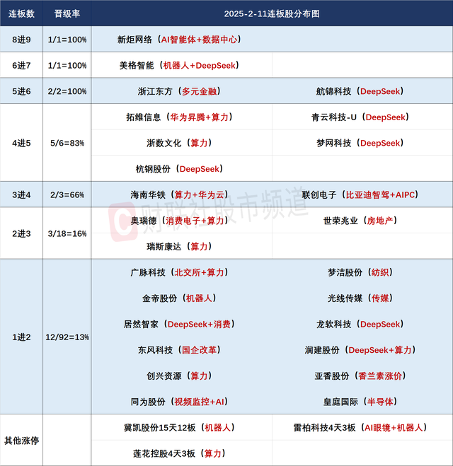 连板股晋级率小幅降至45%,随着并行科技、每日互动等DeepSeek概念高位人气股午后炸板回落,不少20、30CM方向品种开始释放亏钱效应,而10厘米个股仍维持高晋级率,新炬网络将连板高度提升至9板,其余4板以上的10厘米连板股全线实现晋级。不过随着DeepSeek概念午后分歧,资金转向回流低位的传媒等AI应用端以及此前表现持续分歧的机器人概念,10CM机器人高位人气股冀凯股份反包涨停走出15天12板,不排除部分资金抢先手展开博弈的意图。随着双创以及北证两大高弹性方向持续分歧,主板方向的资金接力情绪或有再度加强可能。