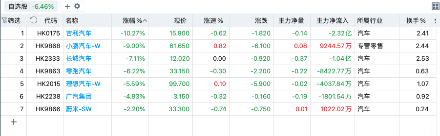 2月11日,港股汽车股表现 同花顺