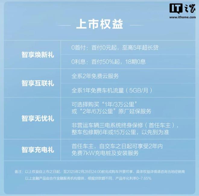 该车上市权益包括:购车金融方案、云服务 / 车机流量权益、售后保障服务、充电桩安装服务等。详情如下: