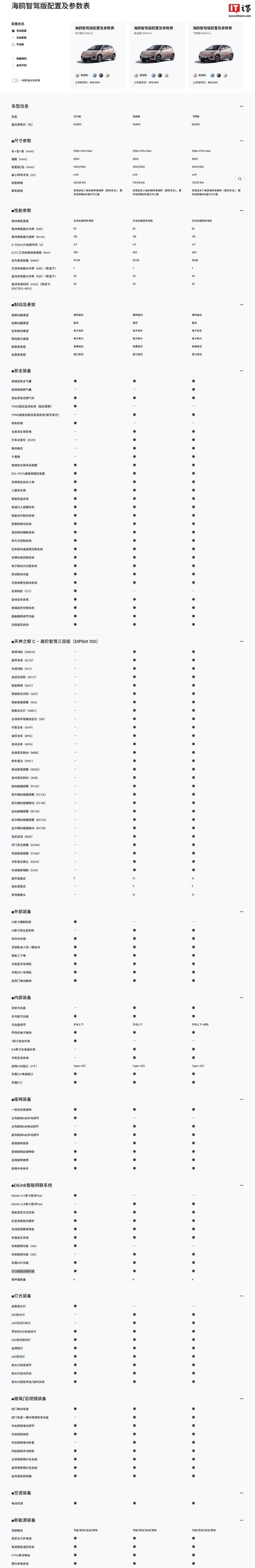 新车全系标配刀片电池,预装智能语音交互系统、比亚迪智能云服务、在线智慧精准导航、车载蓝牙系统、车机联网(4G:活力版;5G:自由版、飞翔版)、车载 WiFi、OTA 智能远程升级等服务和功能。详细配置及参数表如下: