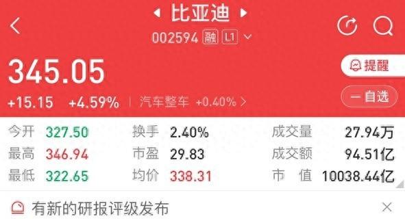 截至今日收盘,比亚迪(BYD)股价大涨4.59%,最新股价达到345.05元,距离其历史最高点354.52元/股仅一步之遥。这一强劲表现使得比亚迪市值重新站上万亿大关,彰显出市场对其未来发展的高度认可。