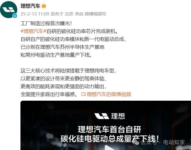 电动知家消息,2月13日,理想汽车宣布,其自研碳化硅功率芯片完成装机,自研自产的碳化硅功率模块和新一代电驱动总成已分别在理想汽车苏州半导体生产基地和常州电驱动生产基地量产下线。官方称,这三大核心技术将陆续搭载于理想纯电车型,以更紧凑的设计带来更安静的驾乘体验、更高效的能耗表现和更强劲的动力输出。