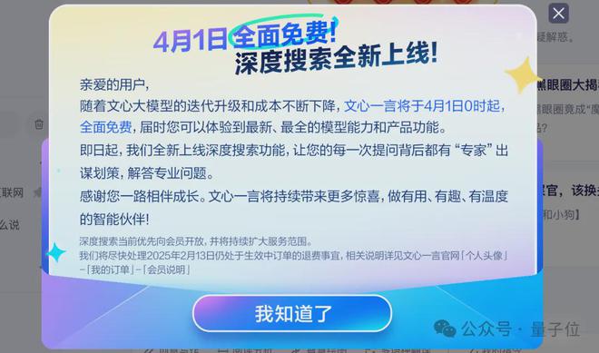 文心一言将于4月1日零时起,全面免费!所有PC端和APP端用户均可体验文心系列最新模型。