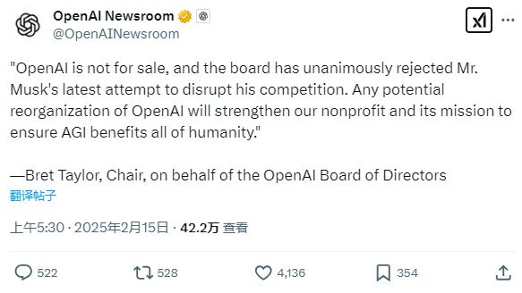 “OpenAI是非卖品,董事会一致否决了马斯克先生破坏竞争的最新企图。OpenAI的任何潜在重组都将加强我们的非营利组织及其使命,以确保AGI造福全人类,”OpenAI在X平台上的账号表示,并引用了OpenAI董事长Bret Taylor代表董事会的表态。