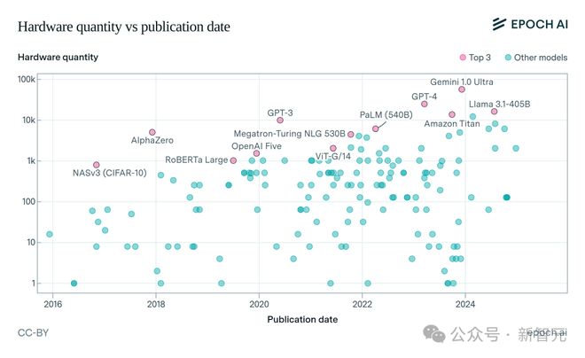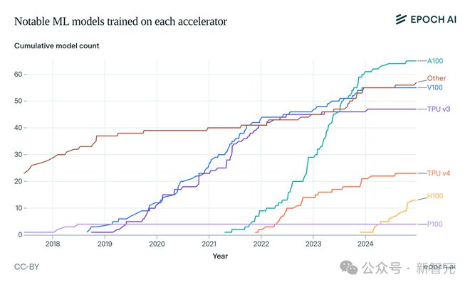 在Epoch的数据集中,NVIDIA A100是用于高引用或最先进人工智能模型的最常用的硬件,自发布以来已用于65个著名ML模型。