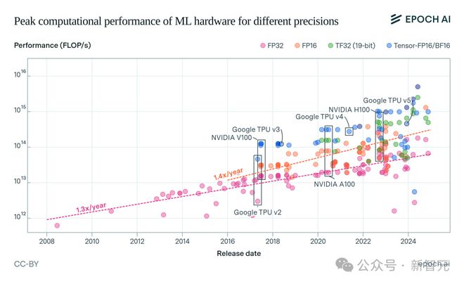 2008至2024年全球机器学习硬件的计算能力示意图除了GPU,硬件类型也丰富了起来。比如,出现了专门处理张量计算的TPU(张量处理单元,Tensor Processing Unit)。