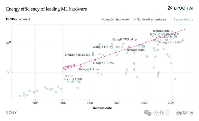 根据历史数据,顶级GPU和TPU的能效每1.9年翻一番。