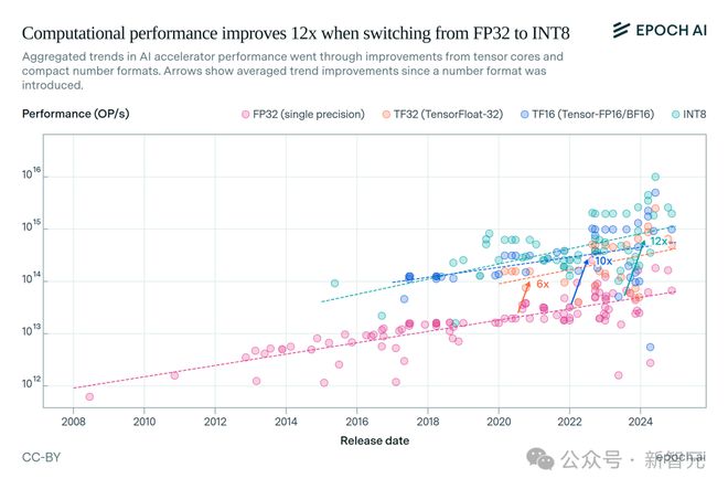 自推出以来,这些改进约占整体性能趋势改进的一半。随着开发人员利用这种性能提升,使用较低精度格式(尤其是张量FP16)训练的模型已经变得很常见。