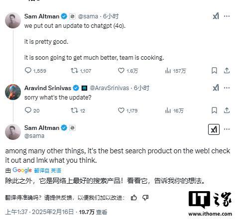IT之家 2 月 16 日消息,OpenAI 首席执行官萨姆・奥尔特曼(Sam Altman)今日在社交平台 X 上表示,该公司对ChatGPT 4o 进行了更新,并表示其已成为“网上最佳的搜索产品”。奥尔特曼在帖子中提到,ChatGPT 4o 表现“相当出色”,并且“很快会变得更好”。他还转发了一些称赞该聊天机器人写作能力“难以置信地好”且“类似人类”的帖子。