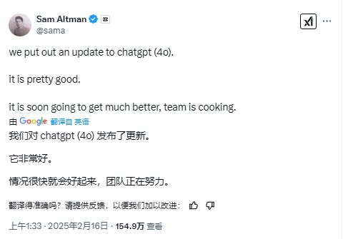 目前尚不清楚奥尔特曼所指的更新是否是 1 月 29 日公司宣布的 ChatGPT 4o 更新,OpenAI 对此尚未回应置评请求。