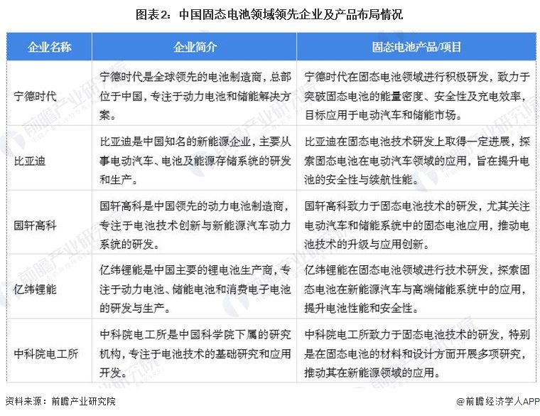 全球固态电池技术仍处于研发投入阶段,暂无明确的行业龙头企业,当前宁德时代、比亚迪和国轩高科等处于领先地位。宁德时代积极布局固态电池技术,重点应用于电动汽车和储能领域;比亚迪和国轩高科也加大研发投入,探索固态电池在新能源领域的应用。其他企业如亿纬锂能和中航锂电也在不断追赶,推动技术进步。