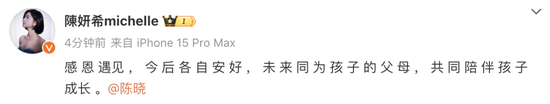 2月18日,陈晓和陈妍希在社交平台发文官宣离婚。两人发布同样的文字内容:“感恩遇见,今后各自安好,未来同为孩子的父母,共同陪伴孩子成长。”并@出对方。