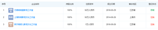天眼查显示,陈晓名下共关联3家工作室,均为陈晓个人独资工作室,其中2家为注销状态,仅存续1家无锡晓晓星影视工作室。