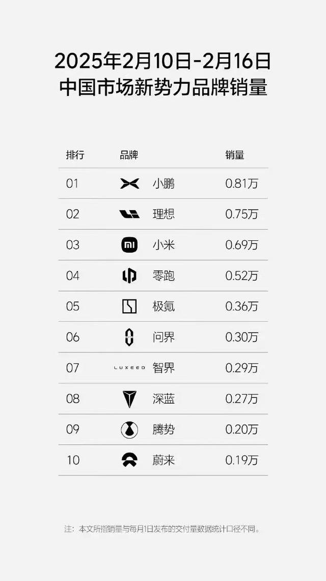 根据中国市场新势力销量榜单的排名情况来看,理想再度被小鹏汽车反超,重新回到了新势力榜首的位置,最新的周销量为0.81万辆,而理想紧随其后,销量为0.75万辆。其实从今年1月份以来,小鹏汽车的势头就十分迅猛,重新夺回了新势力单月销量的榜首位置。
