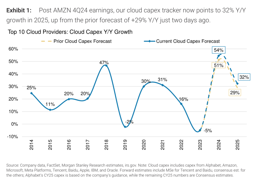 大摩还上调了2025年云大厂支出的预期,增速从同比29%上调至32%。