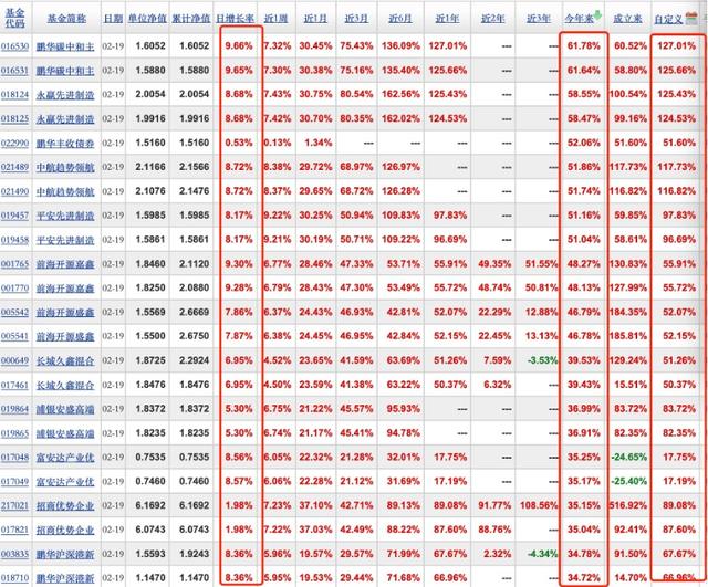 截至2月19日晚间更新净值后,闫思倩管理的鹏华碳中和主题领跑市场,涨幅达到9.66%,前海开源盛鑫混合涨幅达到9.3%,此外,永赢先进制造等十余只产品单日涨幅超8%。