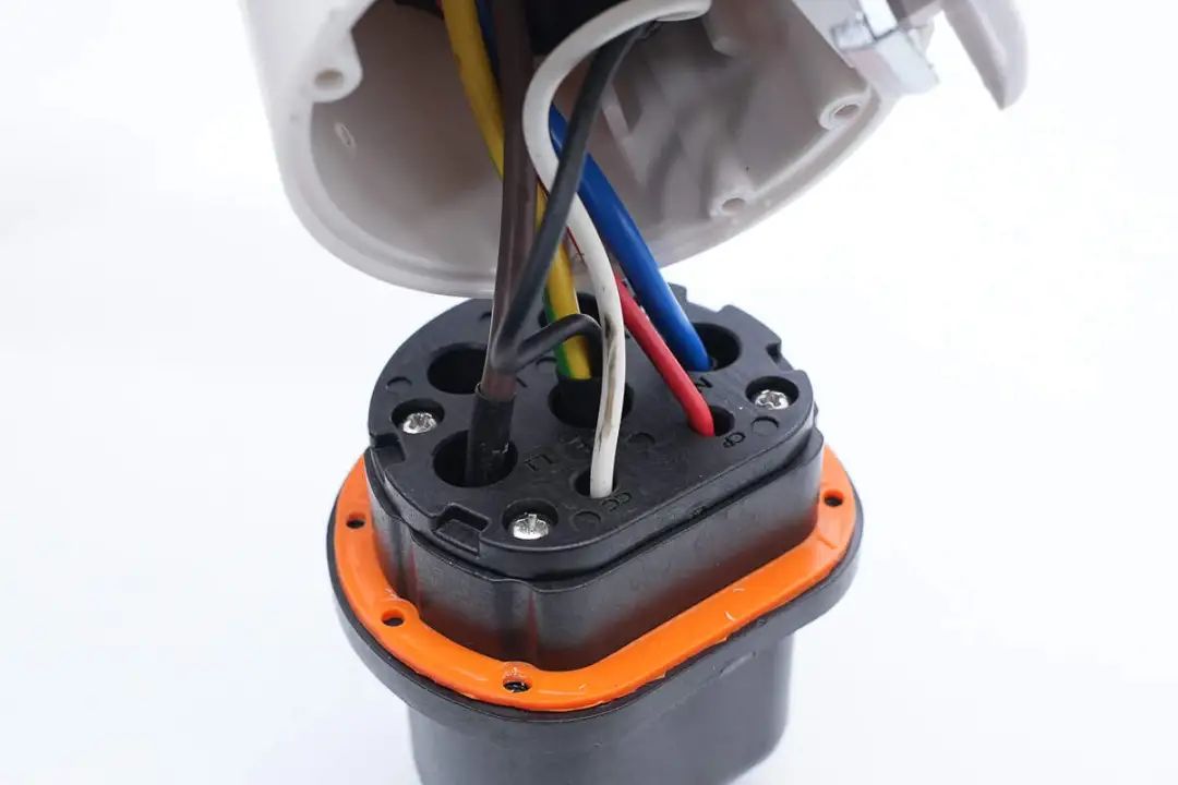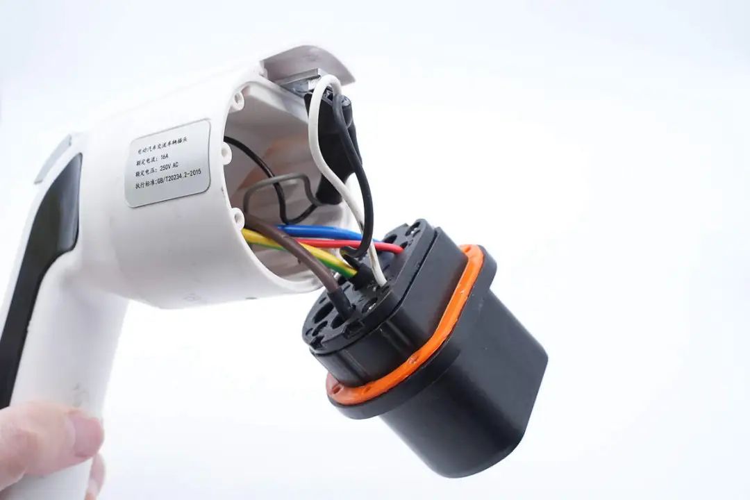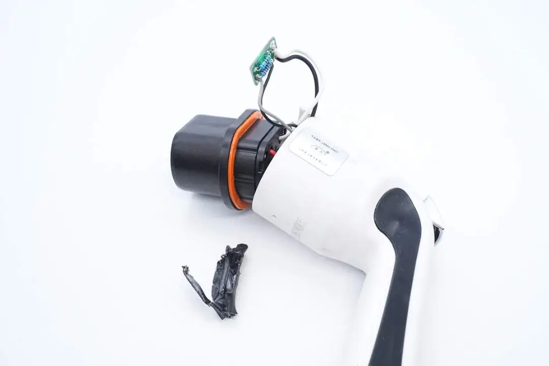 拆解取下充电枪插头,枪头设有橙色密封胶圈。