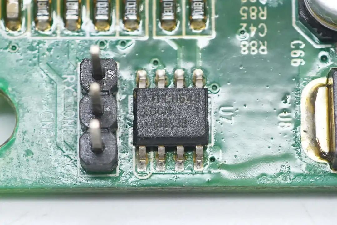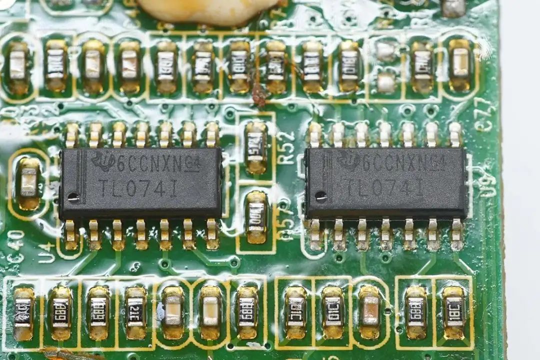 两颗运放来自德州仪器,型号TL074I,为四通道低噪声JFET输入放大器,用于电压参数和电流参数采集,采用SOIC14封装。