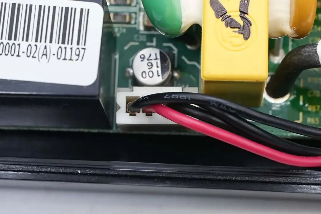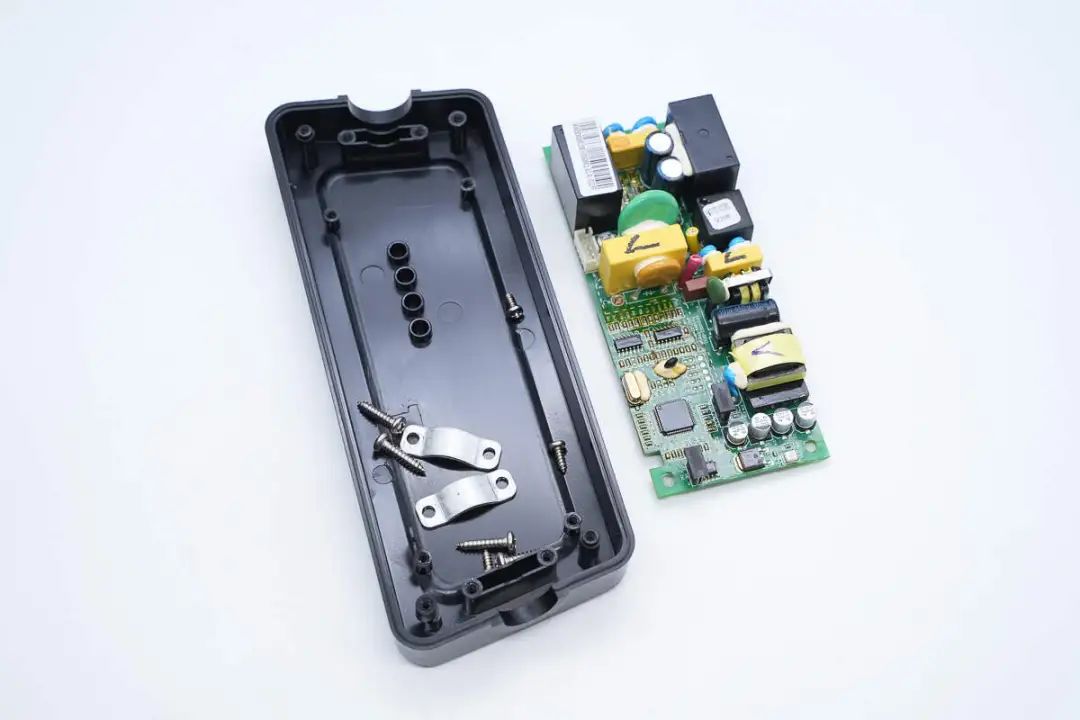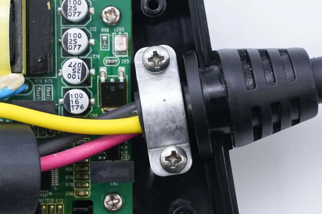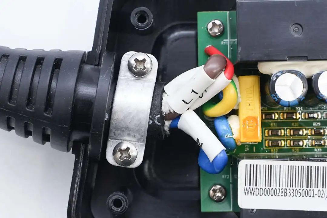 壳体内部一览,输入输出导线均通过压板固定,PCBA模块通过螺丝固定在壳体内部,导线通过焊接连接到PCBA模块。
