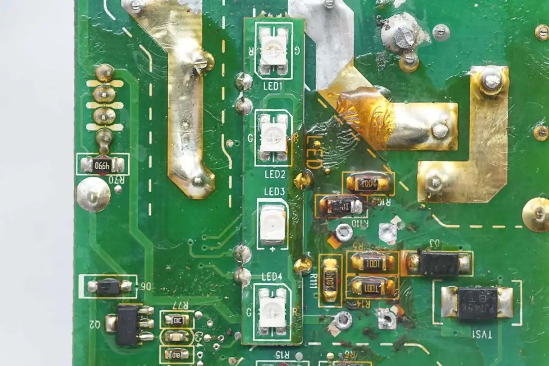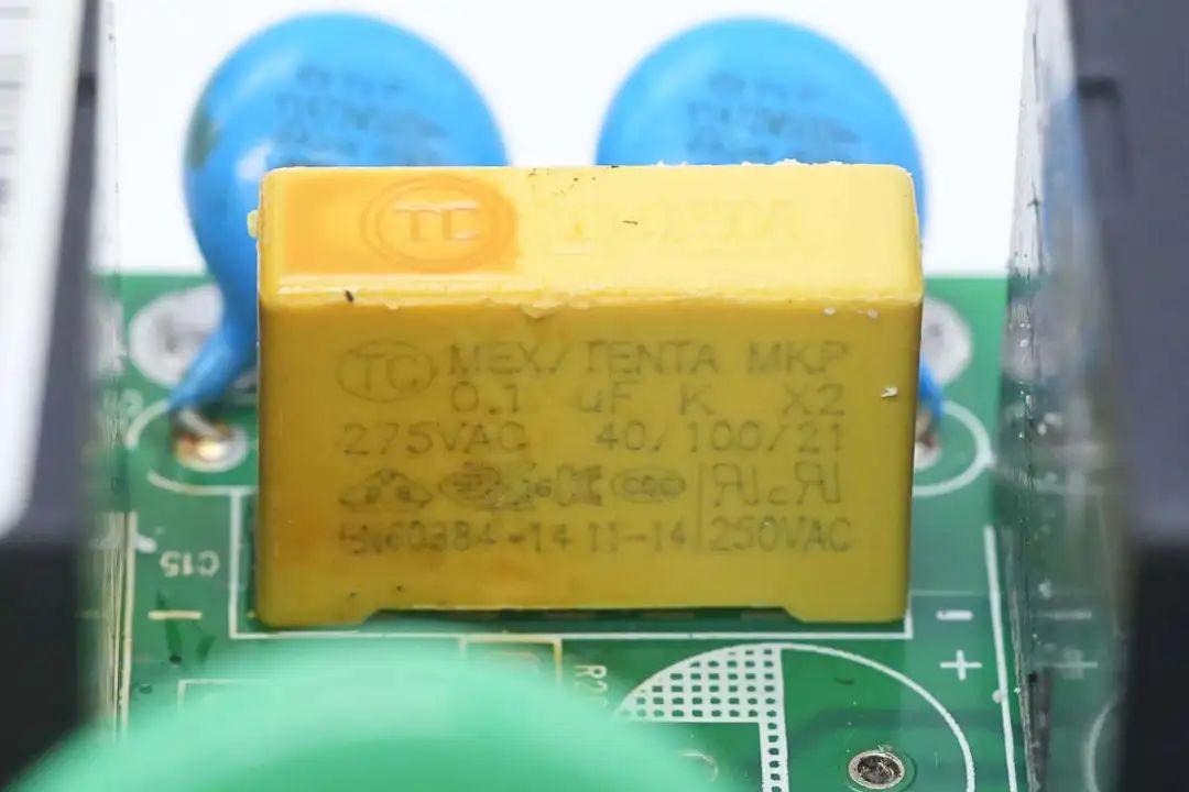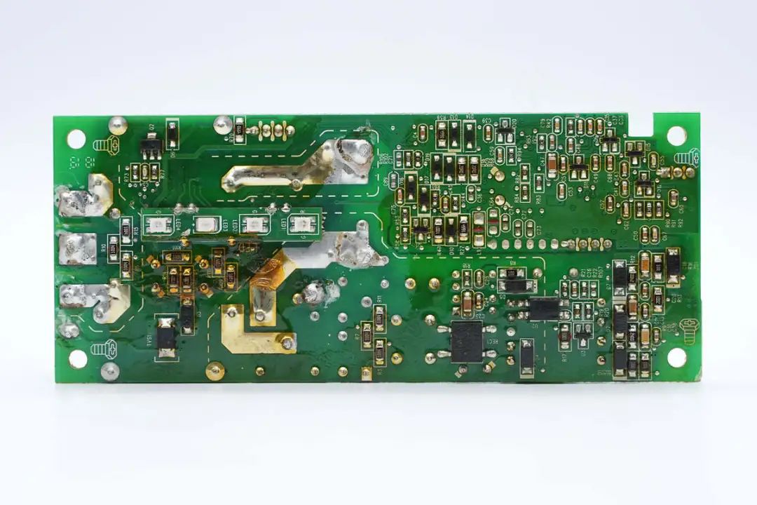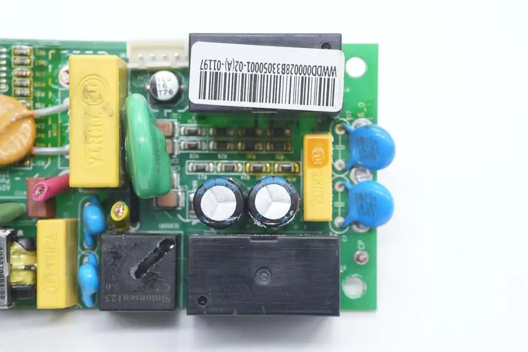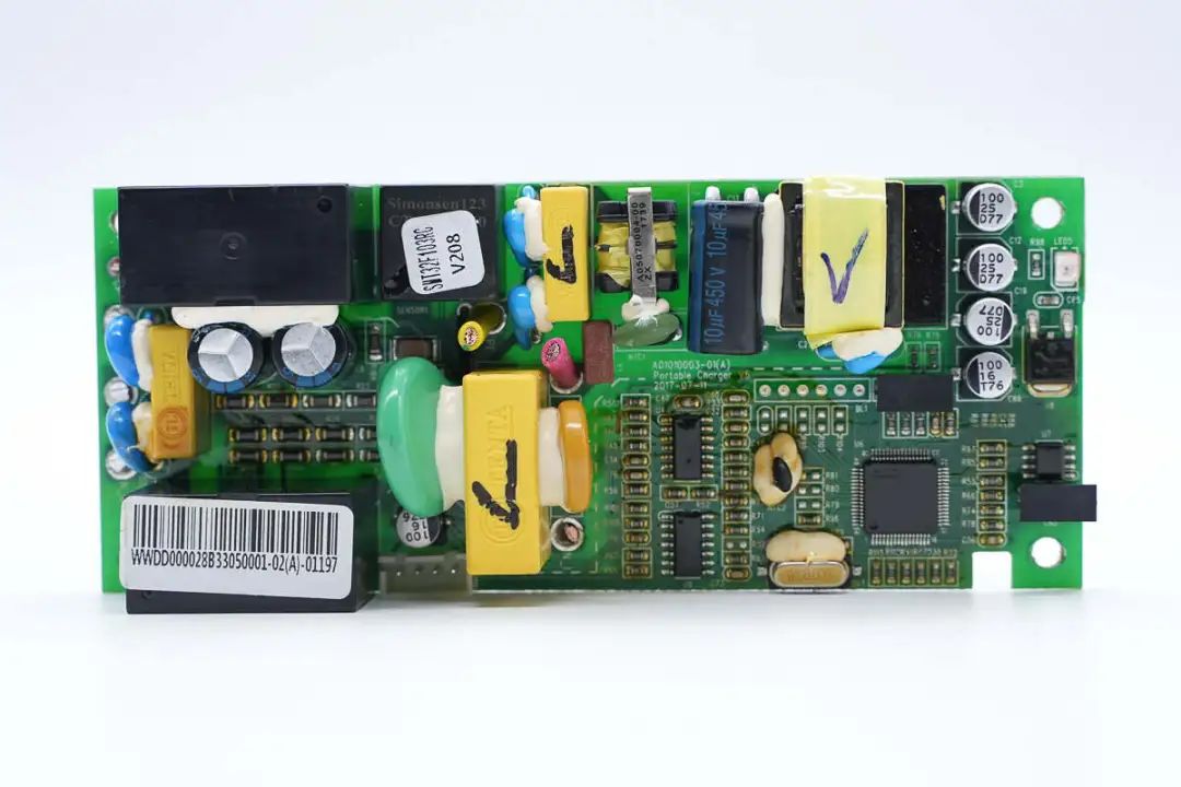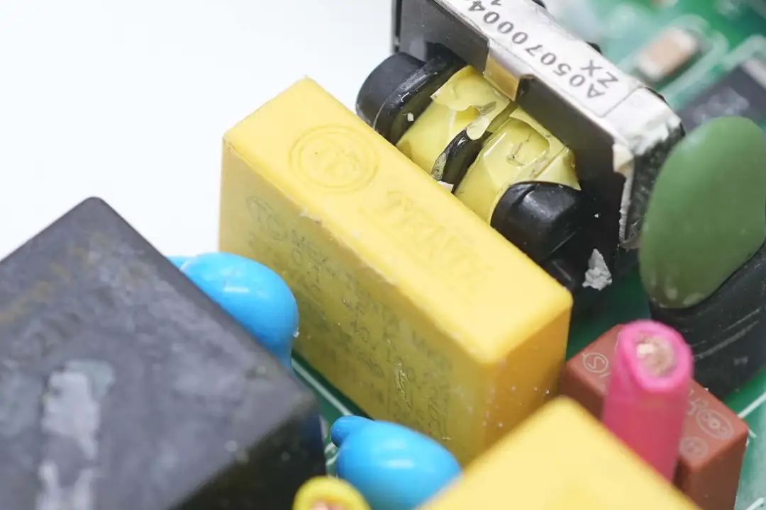 PCBA模块正面一览,左侧上下设有两颗继电器,用于充电控制。上方继电器右侧为电流互感器,下方为压敏电阻和安规X2电容。右侧上方设有控制电源部分,下方为运放和MCU。