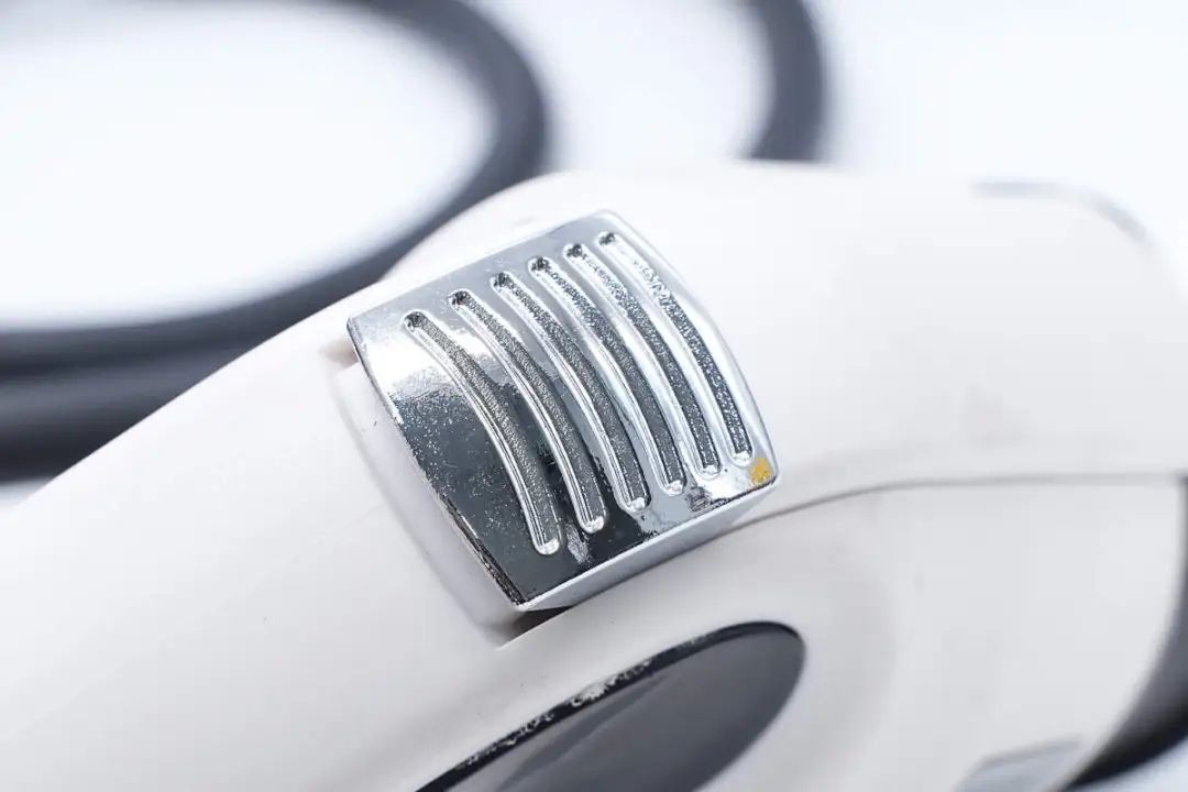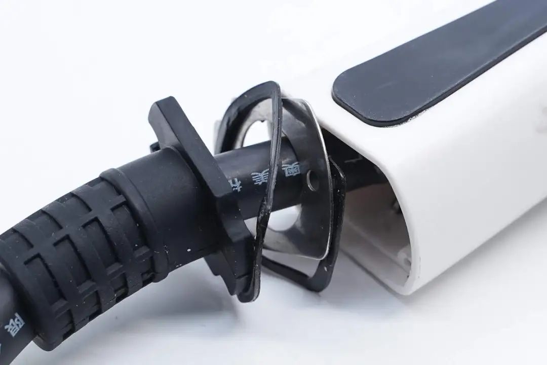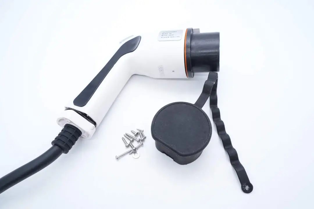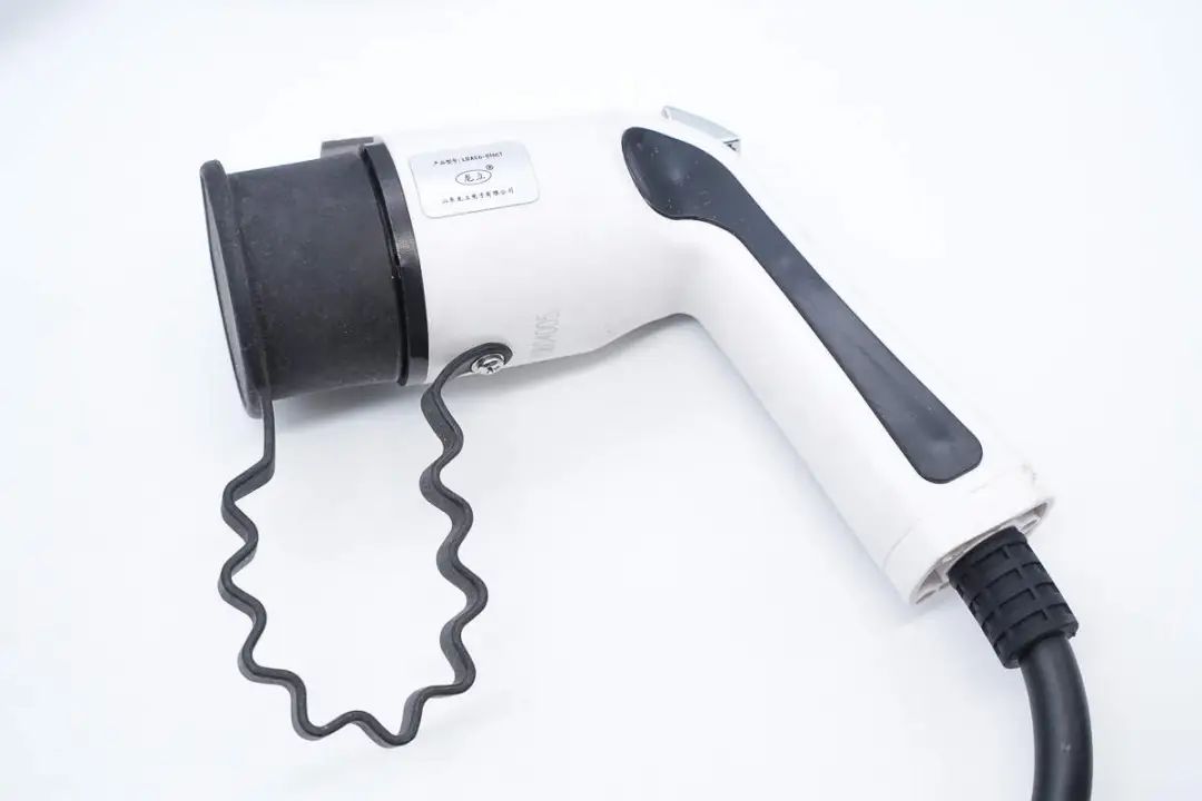 充电枪整体为白色外壳,侧边设有黑色装饰。前端充电枪头端部盖有胶套密封,防尘防潮防氧化。