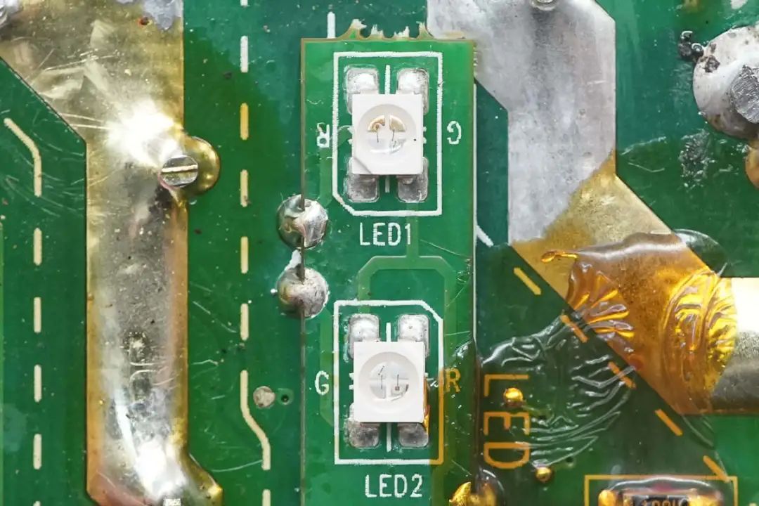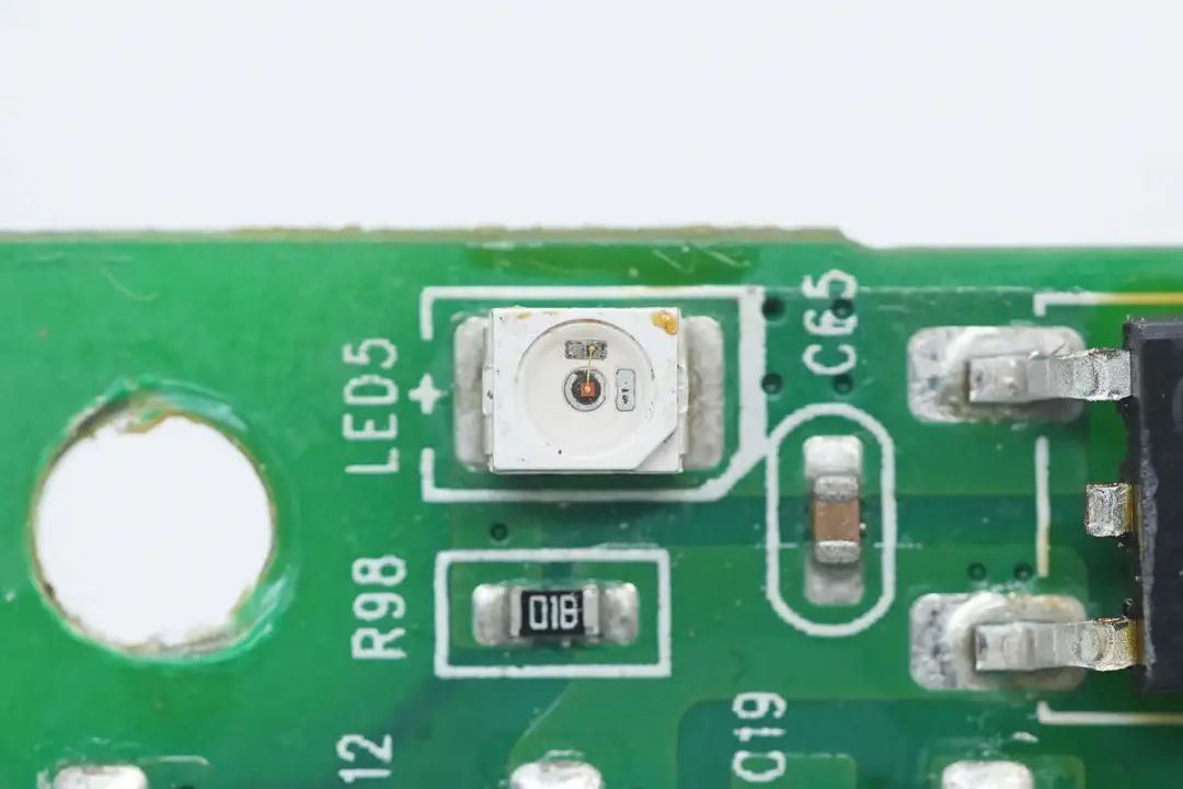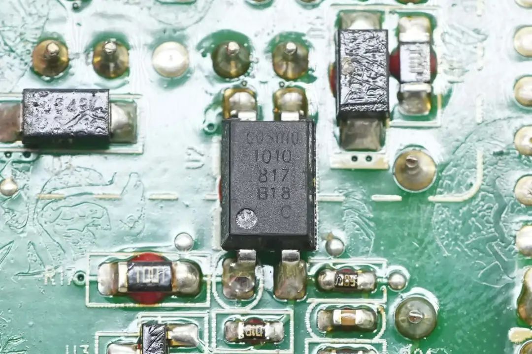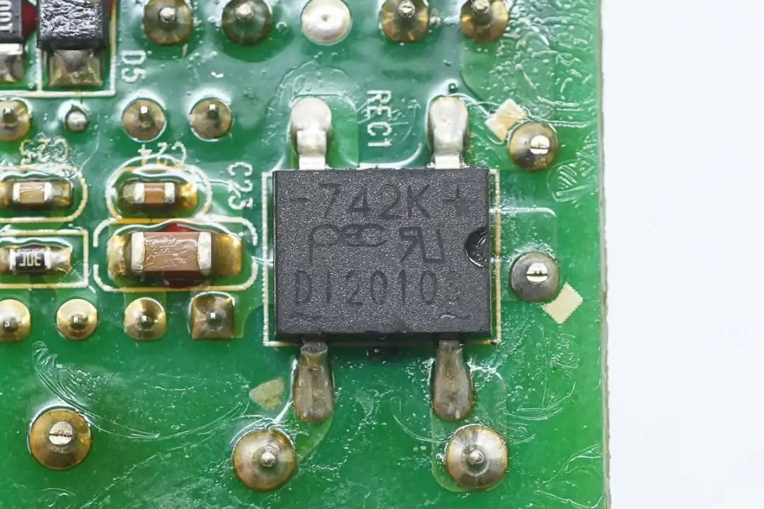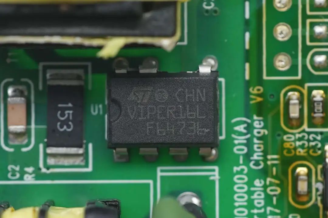 开关电源芯片设置在高压滤波电容下方,来自意法半导体,型号VIPER16L,是一颗内部集成800V开关管的6W高压转换器,采用DIP-7封装。