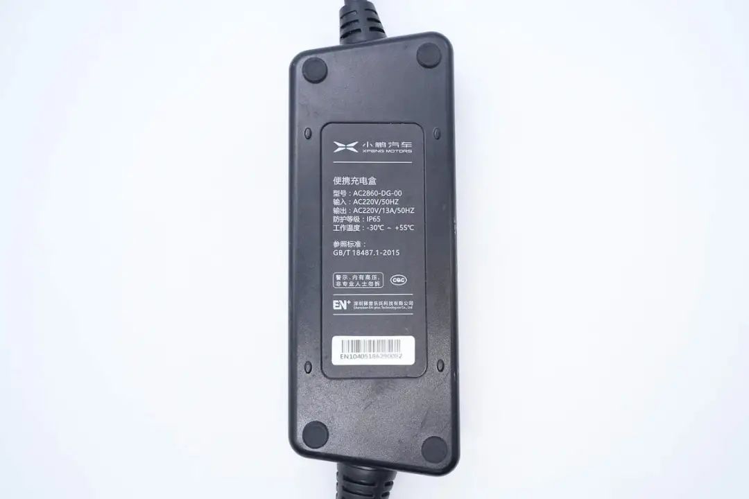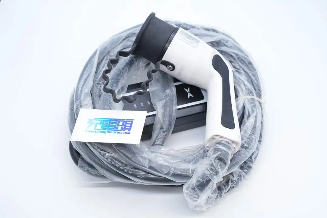 小鹏汽车便携充电枪为常见的充电枪头,充电控制盒和线缆组成,线缆套有塑料袋防尘保护。