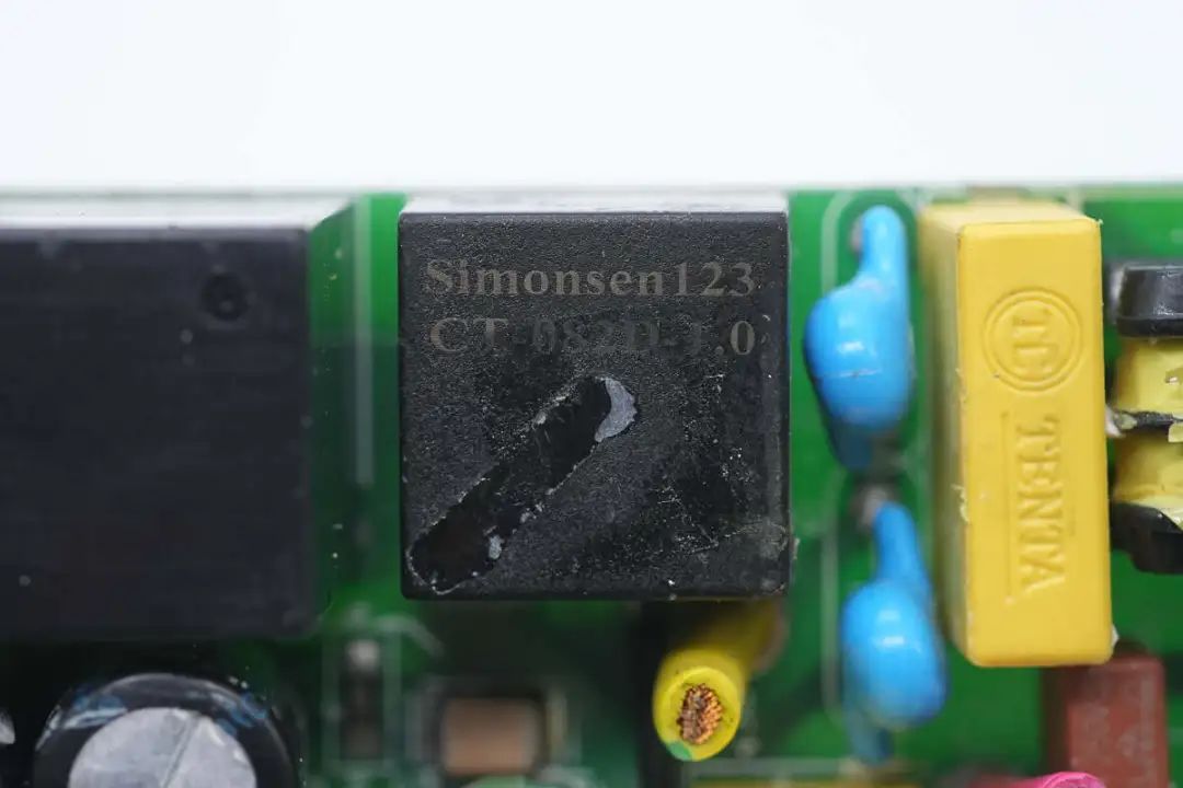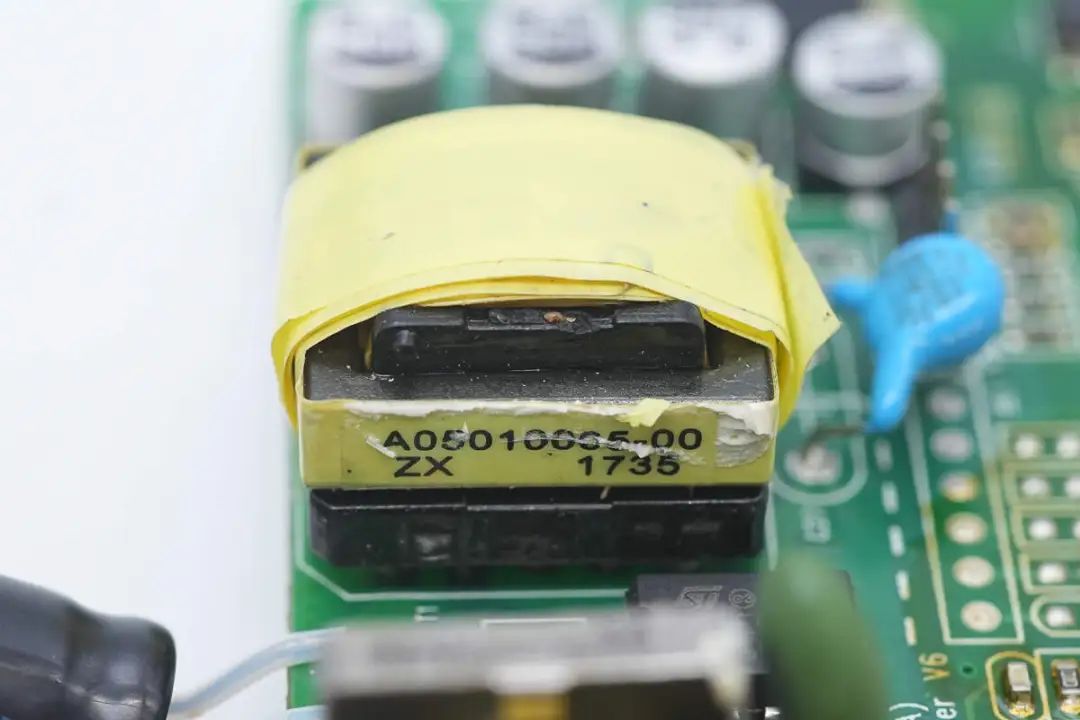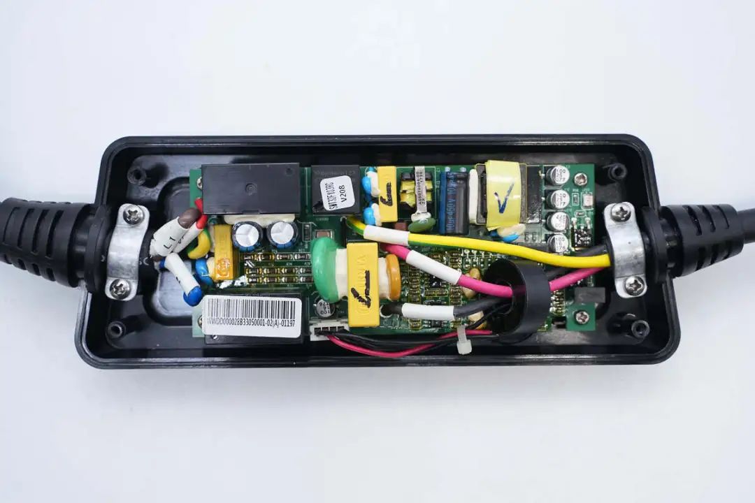控制盒内部开关电源芯片来自意法半导体,稳压芯片来自安森美,使用电流互感器进行电流检测,并使用漏电流互感器用于漏电保护,用于控制充电的继电器来自高登。PCBA模块涂有三防漆,直插元件打胶加固。控制盒内部用料扎实,做工可靠。