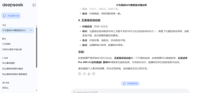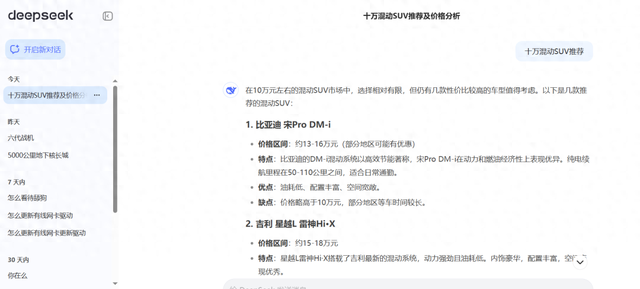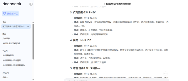 代入最普通消费者,也就是接近小白的程度进行提问,我选的问题是“十万混动SUV推荐”。这是目前的大热门,但实际也是一个非常难回答的问题。而Deepseek(V3联网版)给出的答案,首先是按顺序罗列了比亚迪宋PRO DM-i、星越L雷神Hi·X、传祺GS4 PHEV、长安UNI-K iDD、瑞虎8 PLUS鲲鹏e+、五菱星辰混动版这六个备选项。