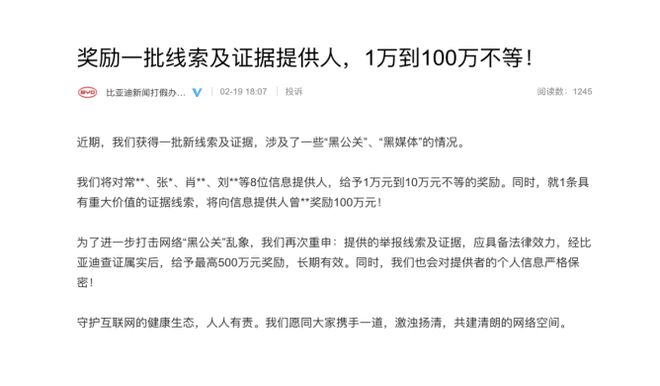2月20日消息,比亚迪新闻打假办宣布,对8位“黑公关”相关信息提供人给予1-10万元不等的奖励,同时,对1位具有重大价值的证据提供人奖励100万元。在2021年,比亚迪就宣布悬赏5-100万元向全网征集线索。为进一步打击和震慑“黑公关”,此后,比亚迪把举报奖励提升至5-500万元,长期有效。