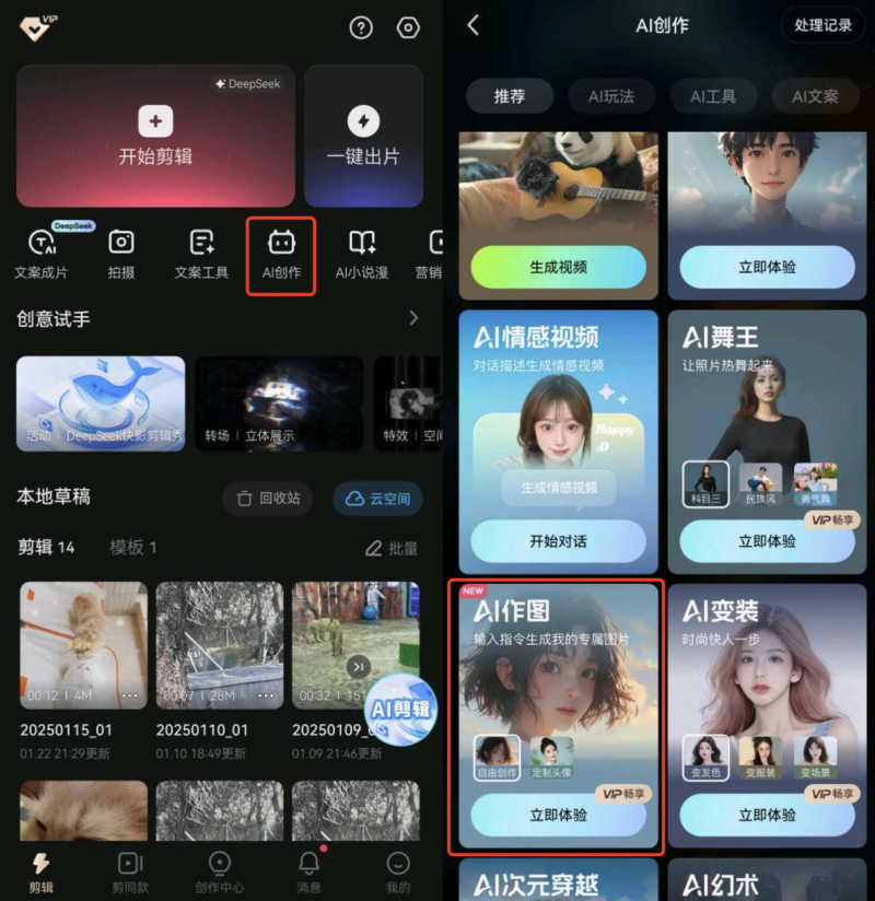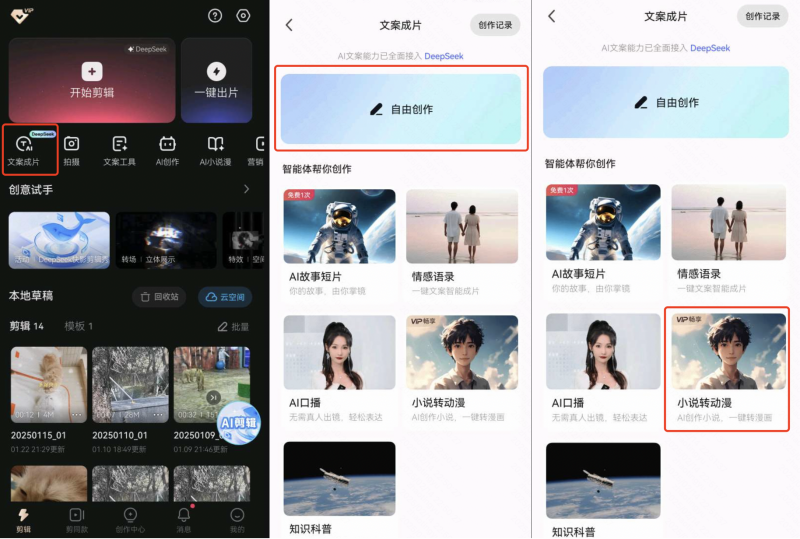 “文案成片”功能下,创作者只需要输入文案,便可以通过AI能力为文案匹配合适的画面,一分钟即可生成一条爆款短视频,不用拍摄、剪辑就能实现高效产出;“小说漫”功能,可以通过DeepSeek将创作者的想法快速生成为小说内容,一键将小说内容转化为小说视频,并支持丰富的画风、配音以及特效的调整。