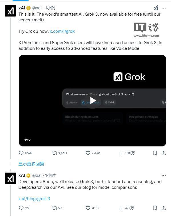 此外IT之家注意到,xAI 还透露,开发者很快将能够通过 xAI 的 API 访问 Grok 3 的标准版和推理版(reasoning version),并提供 DeepSearch 功能。