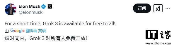 xAI 在其官方 X 账号上发布了这一消息,马斯克也转发该推文称,“短时间内,Grok 3 对所有人免费开放!”