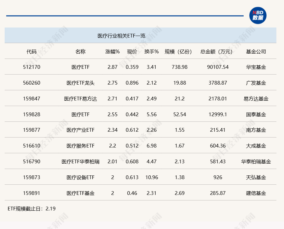 点评:医疗ETF(512170)、医疗ETF龙头(560260)、医疗ETF(159828)、医疗50ETF(159847)今日上午涨幅均在2.5%以上,其中,医疗ETF(512170)半日涨幅为2.87%,其规模达到738.98亿份,半日成交金额高达9.01亿元,上述四只ETF均追踪的是中证医疗指数。