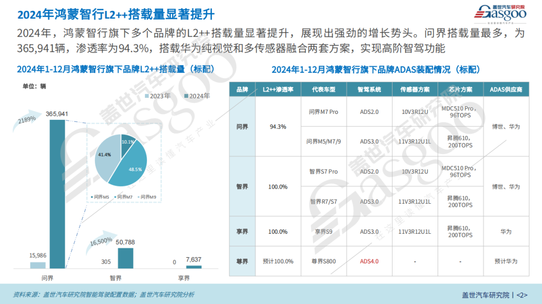 具体来看,2024年,鸿蒙智行旗下多个品牌在L2++级自动驾驶领域表现亮眼。问界的搭载量为365,941辆,渗透率达94.3%。智界品牌于2023年11月发布,L2++系统搭载率达到100%。享界品牌于2024年8月发布,L2++系统搭载率同样达到100%,展现出后发优势。