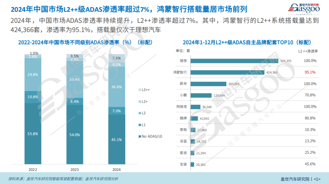 近年来,中国汽车市场智能化变革浪潮汹涌,ADAS渗透率持续上升,成为行业发展的关键指标。盖世研究院发布的智能驾驶配置数据显示,2024年L2++级自动驾驶渗透率已超7%,这一数据直观反映出市场对高级别自动驾驶辅助系统的强劲需求。