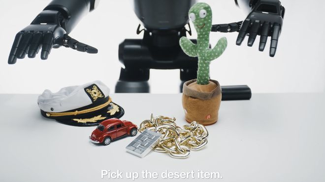 作为这项科技突破的结果,搭载Helix的机器人现在可以根据自然语言指令,识别并拾取几乎所有的小型家居物品,包括机器人从未见过的成千上万物品。在公司给出的案例中,机器人在接受“拿起那个仙人掌”、“拿起沙漠里的东西”时,都能选择最接近玩具的手,成功从一堆物品中拎出仙人掌玩具。