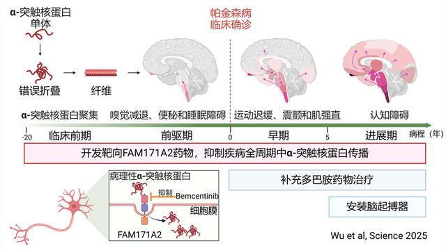 既往研究发现:病理性α-突触核蛋白是帕金森病的关键致病蛋白,在病理条件下,正常的α-突触核蛋白单体会发生错误折叠,并聚集在一起形成纤维,破坏神经元的正常功能并导致其死亡。它还会像“种子”一样播散,入侵邻近的正常神经元,诱导更多脑区α-突触核蛋白聚集和神经元死亡。当致病蛋白传播到中脑黑质区域时,将导致多巴胺能神经元死亡,从而出现动作迟缓、静止性震颤、肌强直等运动症状,当“种子”传播到大脑皮层时,就会出现记忆力下降等认知障碍症状。