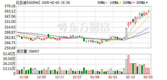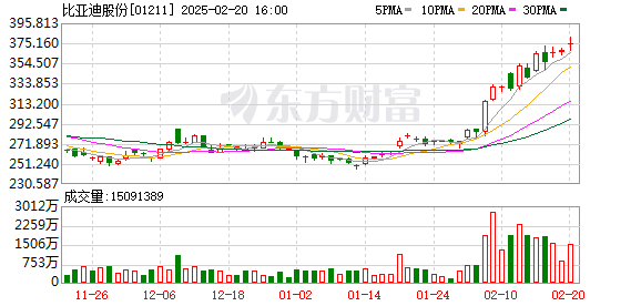 截至2月20日A股收盘,比亚迪股价上涨1.19%,市值1.1万亿元。